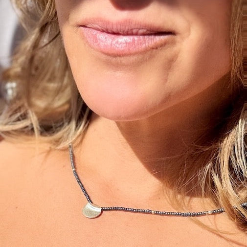 Black Stretchy Boho Seed Bead Necklace with Gold Crescent Moon Charm