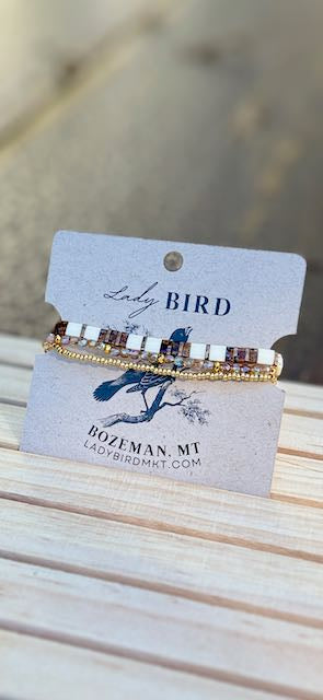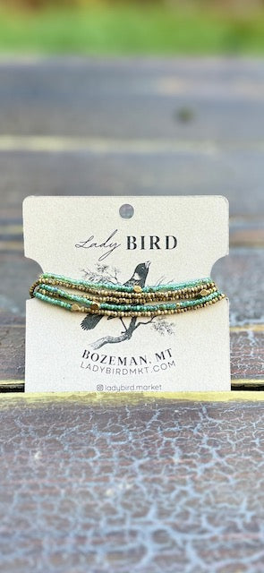 Lady Bird’s signature beaded wrap bracelets double as vibrant boho necklaces, featuring colorful seed beads with silver or gold accents for effortless, versatile style.