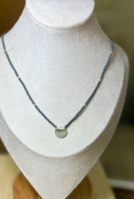 Steel Gray Boho Beaded Necklace with Pure Silver Circle Pendant