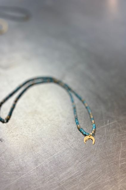 Sparkly Blue Moon Boho Beaded Necklace with Gold Moon Charm
