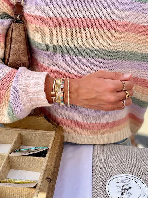 For a set price, you’ll receive a mystery bracelet stack designed to reflect the season’s colors and vibes. Each month’s set is unique, always valued above the individual purchase price, and curated to layer effortlessly with your collection. Although the style is a mystery, you can choose a preference for gold or silver.