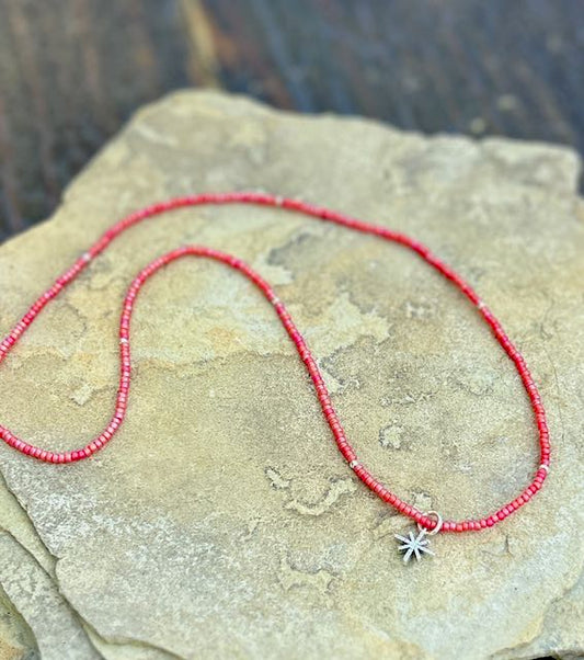 Speckled Red & Gold or Silver Starburst Bling Stretchy Seed Bead Pendant Necklace