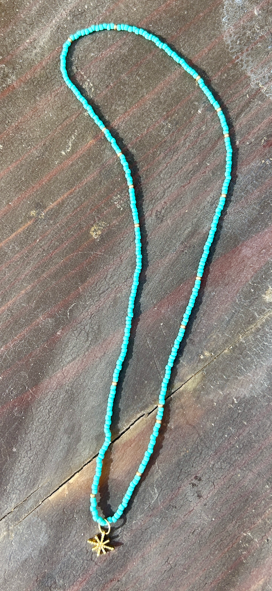 Gold Starburst Bling Turquoise Stretchy Seed Bead Necklace
