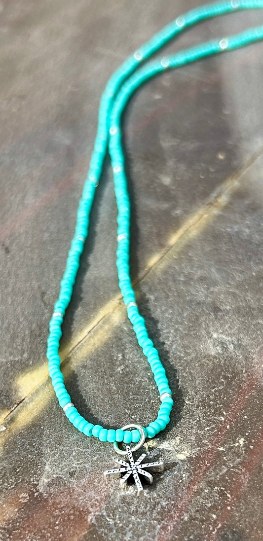 Silver Starburst Bling Turquoise Stretchy Seed Bead Necklace