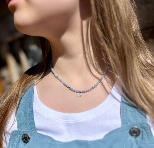 Angelite Gemstone Stretchy Necklace – Boho Western Jewelry with Stamped Sterling Silver Flower Pendant