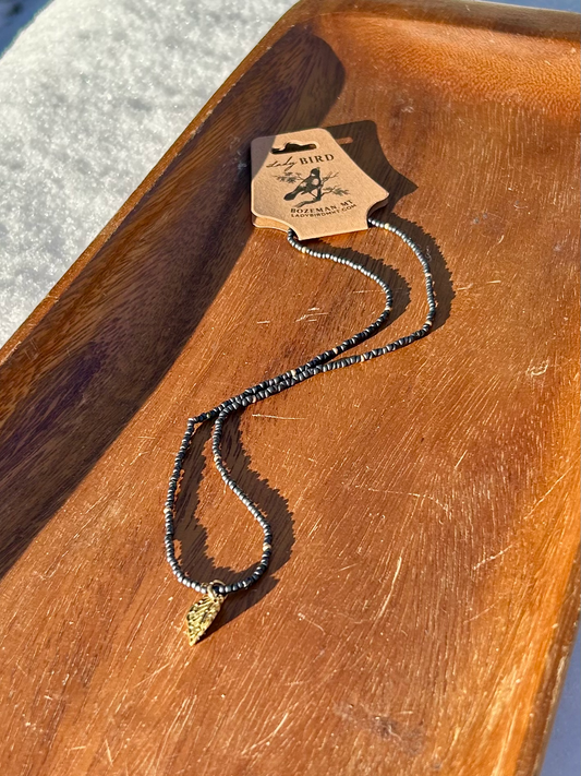 Steel Grey & Gold Boho Seed Bead Necklace, Leaf Pendant