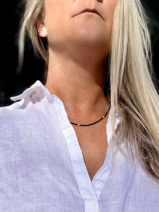 Simply Delicate Navy Blue Seed Bead Stretchy Necklace with Chunky Gold Beads