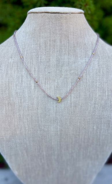 Champagne Boho Beaded Necklace with Gold Crescent Moon Charm