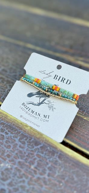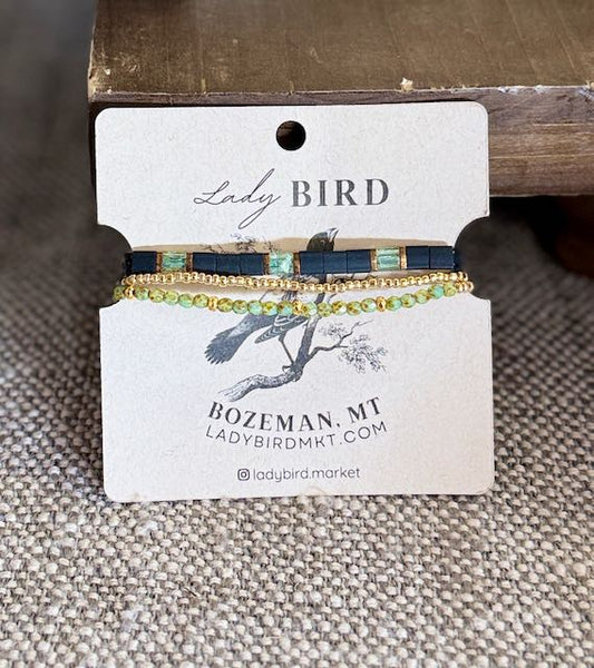 Mossy Green Forest & Teal Tila Bead Bracelet Set | Handmade Stretchy Boho Wrap in Gold or Silver