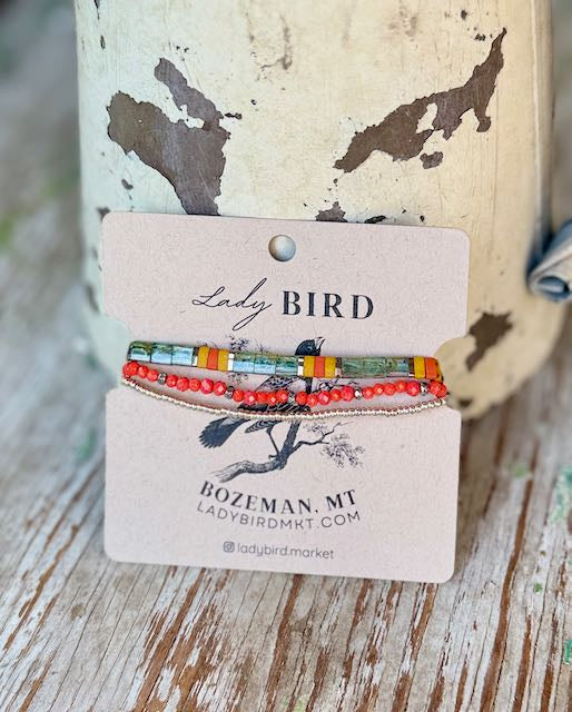 Mossy Green Forest & Orange Tila Bead Bracelet Set | Handmade Stretchy Boho Wrap