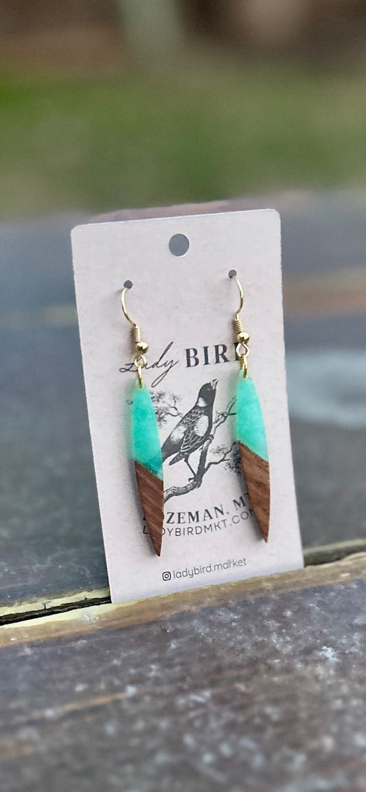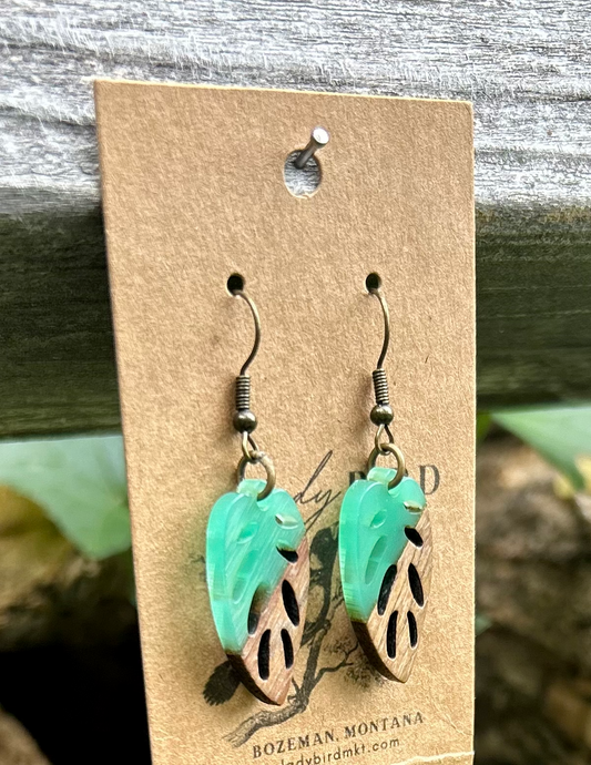 Walnut Wood & Turquoise Resin Leaf Earrings