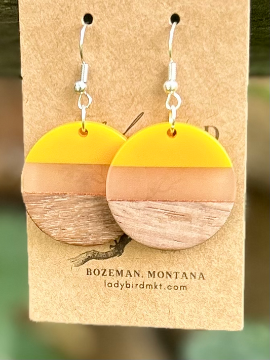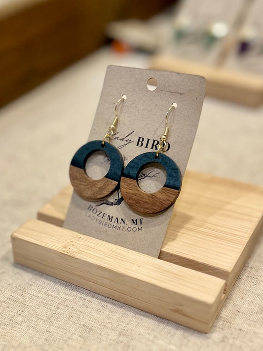 Walnut Wood & Blues Mix Resin Circle Earrings