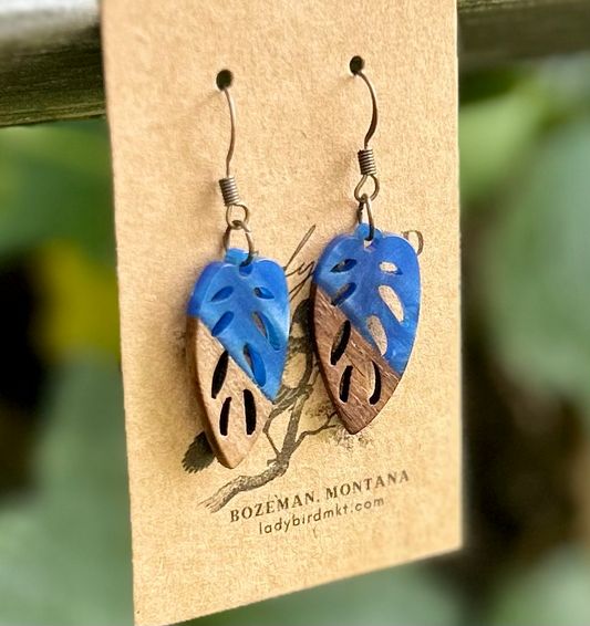 Walnut Wood & Royal Blue Resin Leaf Earrings