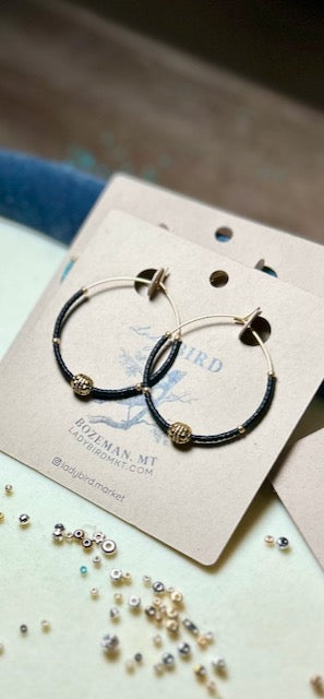 Classic hoop earrings featuring matte black Czech glass seed beads with an etched metallic gold barrel bead for a decorative centerpiece. These beaded hoop earrings perfectly blend bohemian charm and contemporary style, and you can pair them with the matching beaded wrap bracelet for the win.