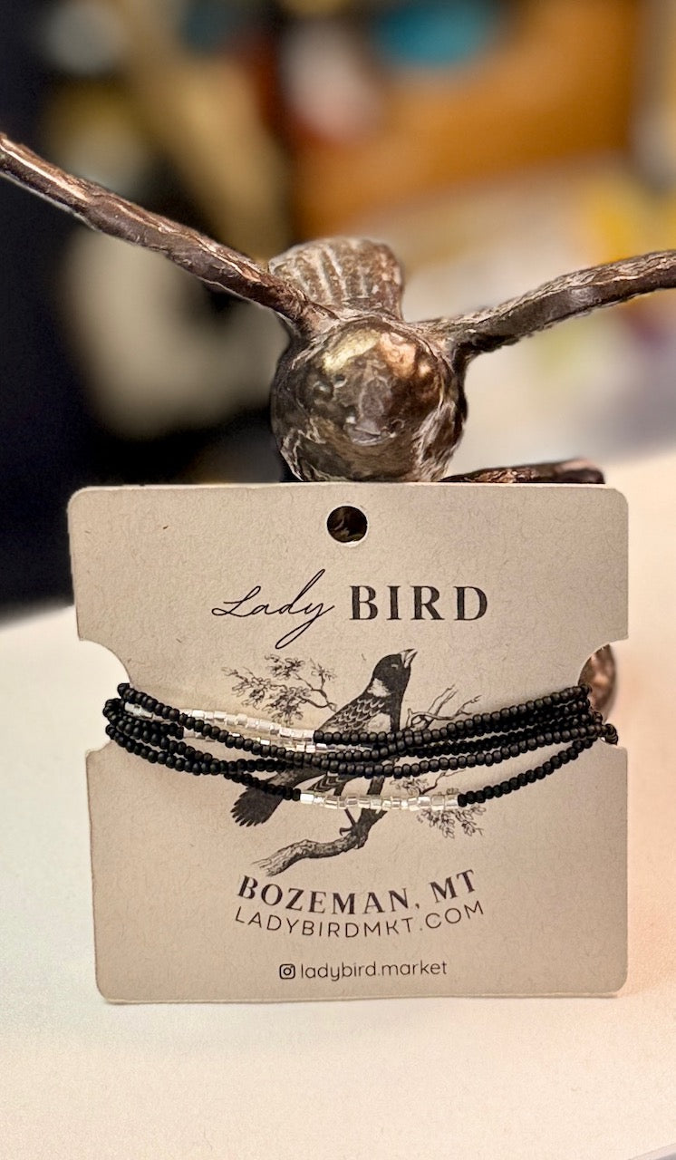 Add a touch of elegance and boho-chic shimmer to your look with this versatile wrap bracelet and necklace from Lady Bird. Handcrafted with matte black and shiny silver Czech glass seed beads, each piece is designed to stand out. Add a pair of our black & shimmery silver dangle earrings for the win!