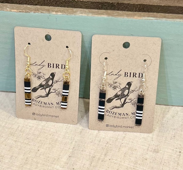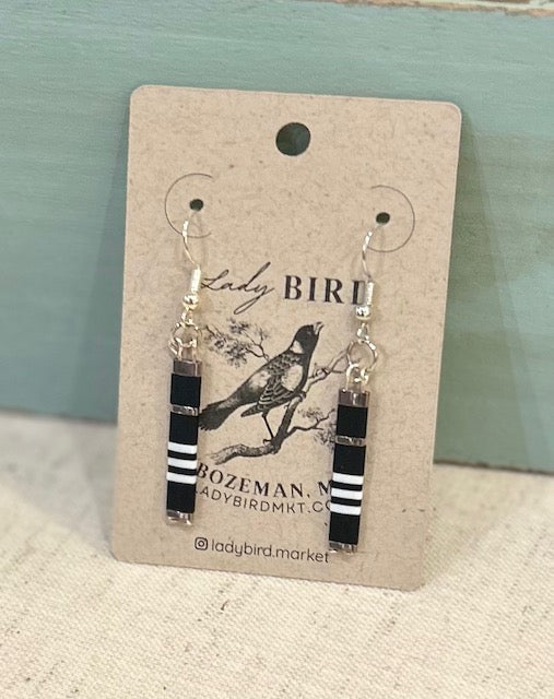 Black & White Zebra Striped & Silver Tila Bead Dangle Earrings