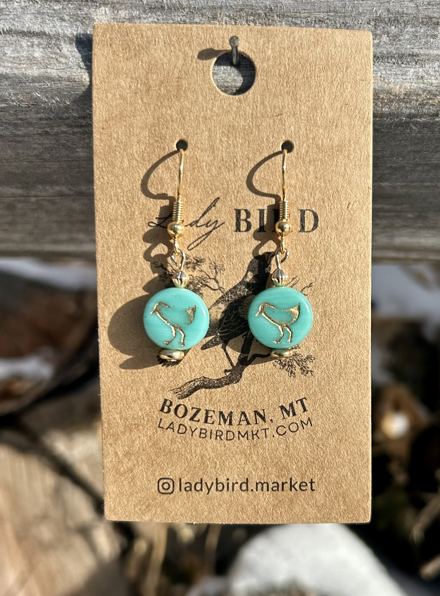 Czech glass coin beads in a soft, sweet turquoise. Each bead is adorned with an etched golden bird motif. These nature-inspired bird earrings offer a touch of turquoise, a versatile choice to accompany any outfit.