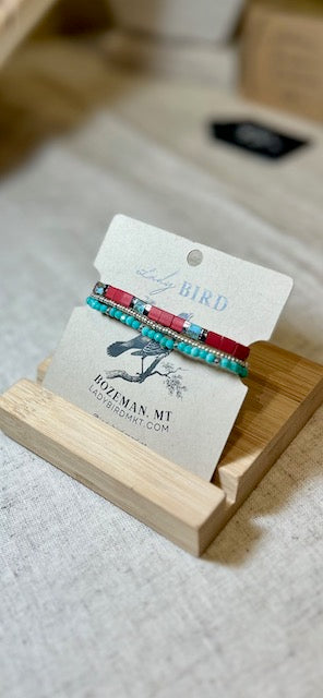 A vibrant combination of red, speckled turquoise, and silver or gold tila beads, this stretchy bracelet set is accompanied by a turquoise and silver or gold Czech glass bead stretchy wrap that goes around your wrist two times. As two separate pieces for a stacked bracelet look, the Tila bracelet and wrap bracelet can be worn on their own, but they're even better together! Or EVEN better, pair them with matching tile-beaded dangle earrings and one of our seed bead wrap bracelets for the win!