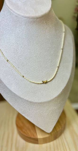 Creamy White Moon Boho Beaded Necklace with Gold Moon Charm