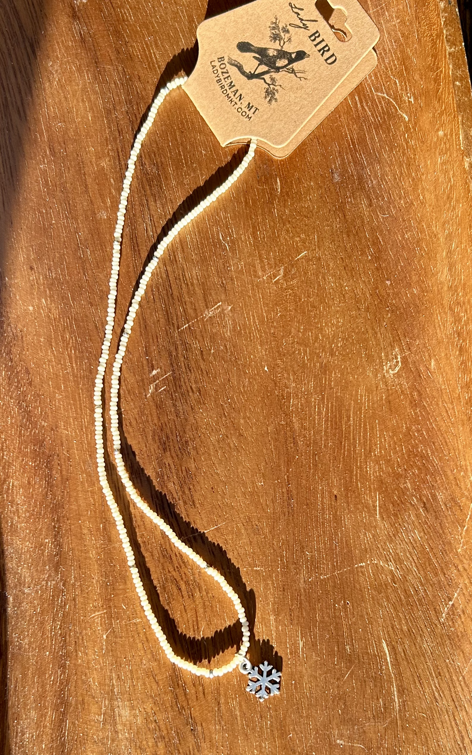 Creamy white/ivory-colored Czech glass seed beads are paired with metallic silver beads with a silver snowflake pendant centerpiece. Strong, stretchy elastic makes it easy to pull it on overhead, without the hassle of a clasp.