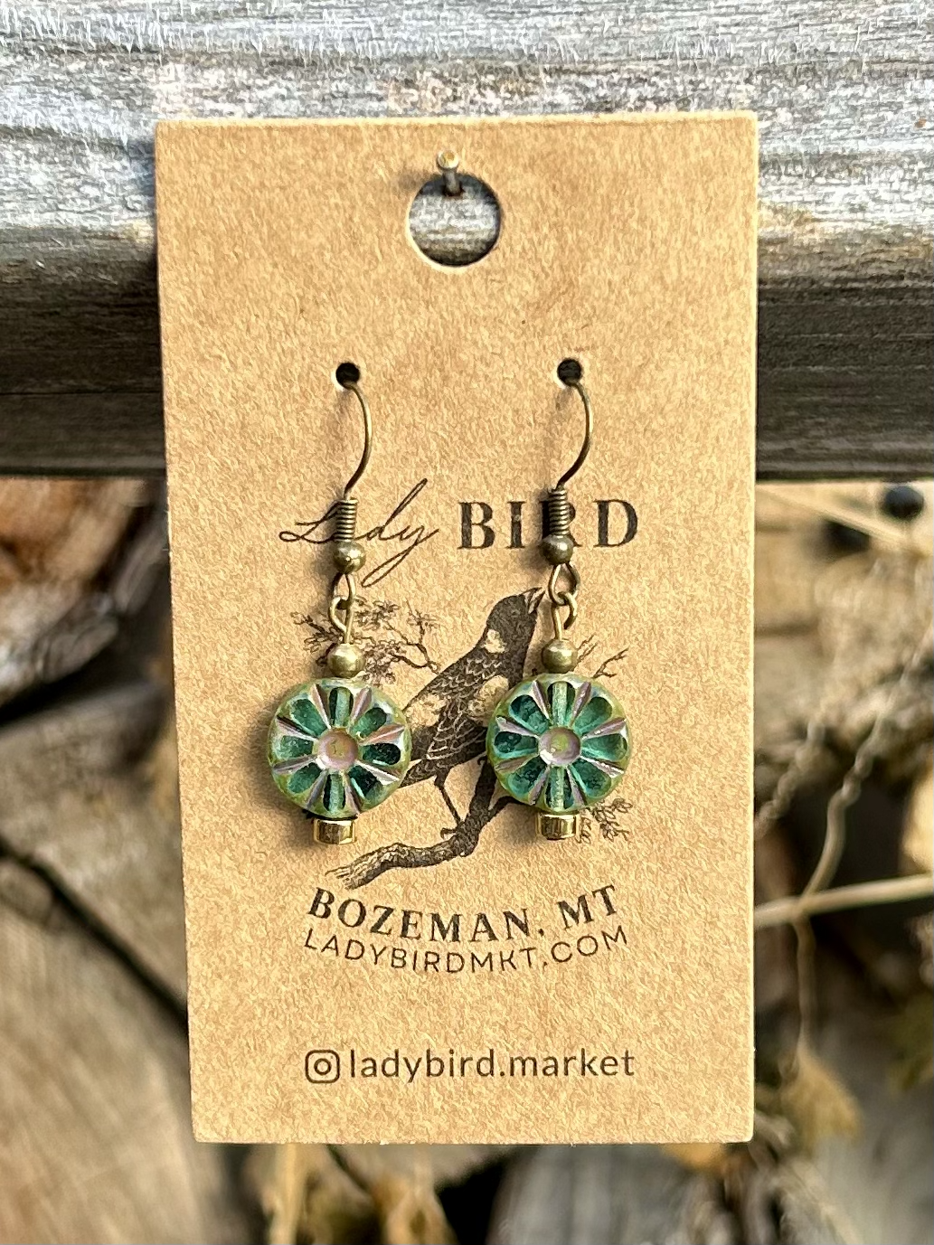 Czech Glass Bronzed Aquamarine Flower Window Coin Earrings