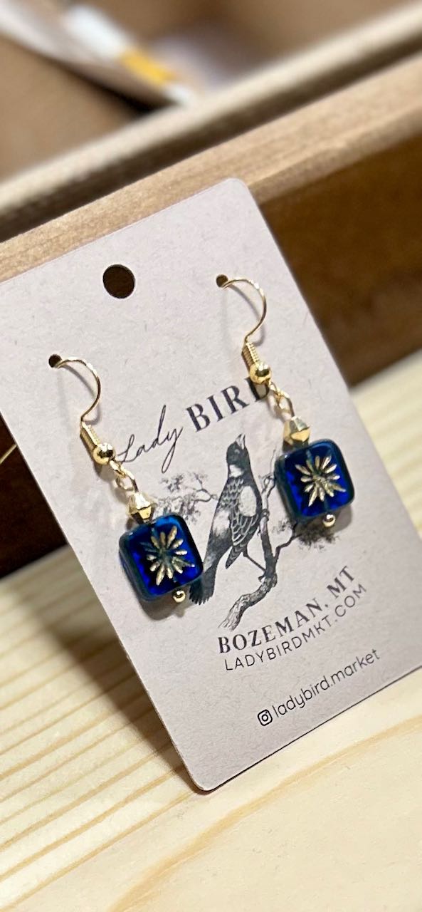 Add a touch of casual elegance and craftsmanship to your everyday outfits with our translucent cobalt blue & gold star flower-style etched glass dangle earrings. These exquisite beads are meticulously crafted in the Czech Republic, known for its centuries-old glassmaking tradition. Each bead features intricate etching that creates a textured, frosted look, adding depth and character to your pendant earrings.