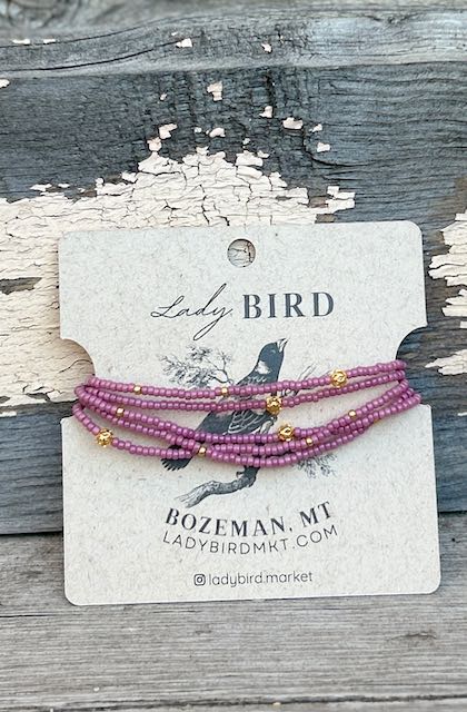 A beautiful shade of pale purple/orchid Czech glass seed beads and sprinkles of gold metallic decorative beads, these wrap bracelets are designed to add a bohemian flair to any outfit. Handcrafted with strong elastic cording, these stretchy bracelets effortlessly wrap around your wrist five times or around your neck two times as a choker-style necklace, providing a comfortable, lightweight, durable fit for all-day wear and active outdoor play.