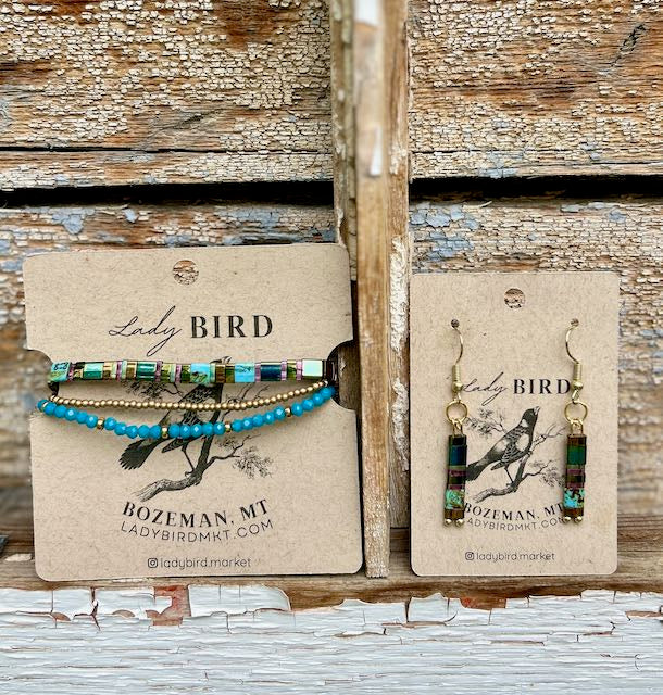 Made with a vibrantly funky mix of blues, greens, and even a touch of purple, these patterned Japanese glass tile bead earrings come in silver or gold. This set is classy yet playful, with a tinge of boho style, designed to make you and your outfit happy. Pair it with a stack of Tila bead stretch bracelets for the win!