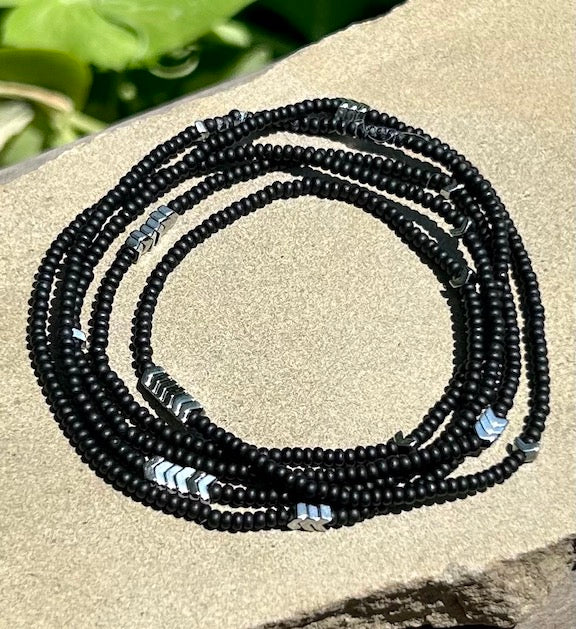 Handcrafted with jet black Czech glass seed beads and featuring gold or silver hematite chevron arrow-shaped beads, these wrap bracelets are designed to add a bohemian flair to any outfit. Made with strong elastic cording, these stretchy bracelets effortlessly wrap around your wrist five times or around your neck two times as a choker-style necklace, providing a comfortable, lightweight, durable fit for all-day wear and active outdoor play.