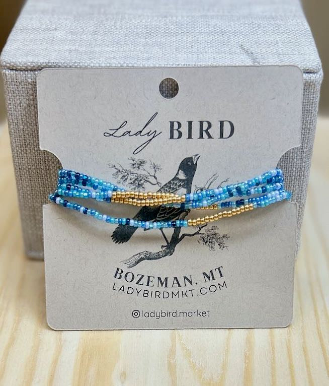 Hand-strung with a mix of blue Czech glass seed beads and strips of gold or silver beads, this piece embodies the perfect blend of casual cool and understated elegance. The smooth, stretchy design lets you slip it on in seconds—no clasps, no hassle—just effortless styling.