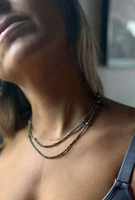 One of Lady Bird's all-time bestsellers, made with a beautiful mix of green and brown-hued Czech glass seed beads and featuring gold metallic decorative beads, these wrap bracelets are designed to add a bohemian flair to any outfit. Made with strong elastic cording, these stretchy bracelets effortlessly wrap around your wrist five times or around your neck two times as a choker-style necklace, providing a comfortable, lightweight, durable fit for all-day wear and active outdoor play.