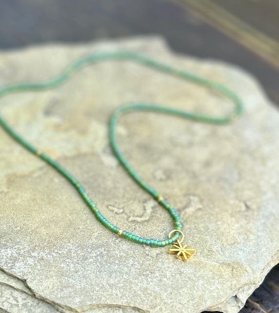 Made with speckled bright green Czech glass seed beads, sprinkled with silver or gold metallic beads on strong elastic cording and featuring a metallic silver or gold starburst charm with a sparkly side for a touch of bling. These delicate, simple, and classy stretchy Boho beaded necklaces go right over the head, without the hassle of a clasp.