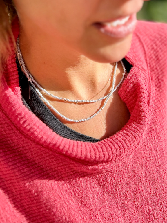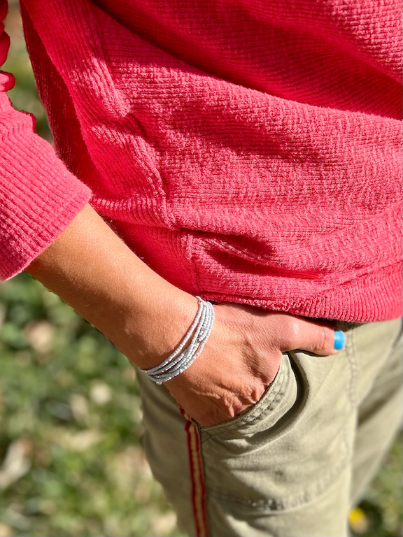 A beautiful shade of light grey with a hint of pale periwinkle Czech glass seed beads and sprinkles of silver metallic decorative beads, these wrap bracelets are designed to add a bohemian flair to any outfit. Handcrafted with strong elastic cording, these stretchy bracelets effortlessly wrap around your wrist five times or around your neck two times as a choker-style necklace, providing a comfortable, lightweight, durable fit for all-day wear and active outdoor play.