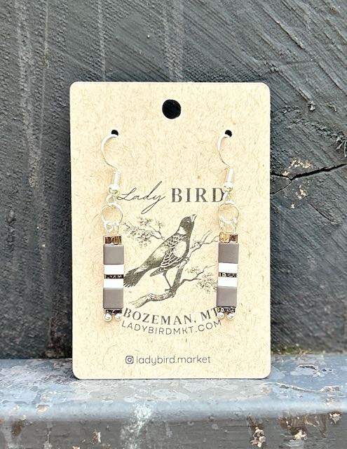 Gunmetal Grey tila beads are paired with black and white stripes, these patterned Japanese glass tile bead earrings come in silver or gold. This beaded earring set is classy yet playful, with a tinge of boho style, designed to make you and your outfit happy. Pair it with a stack of Tila bead stretch bracelets for the win!