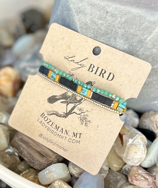 Bring playful color and effortless style to your wrist with this vibrant two-piece bracelet set! Featuring bold jet black and sunflower yellow Japanese Miyuki Tila beads patterned with marbled turquoise, paired with a complementary green Czech glass stretch wrap in silver or gold accents.