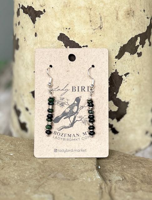 Kambaba Jasper is paired with silver or gold-hued metal to create a bohemian-style dangle earring with class. Kambaba is a mesmerizing gemstone with a deep, earthy appearance, often showcasing a mixture of green, black, and olive tones. What makes it unique are the intricate, swirling patterns of black or dark green orbs and spots that create an almost cosmic or ancient look, as if you're gazing into a forest or a mysterious galaxy. This stone’s surface is usually smooth and polished, giving it a subtle sheen that enhances its intricate patterns and adds to its natural beauty.