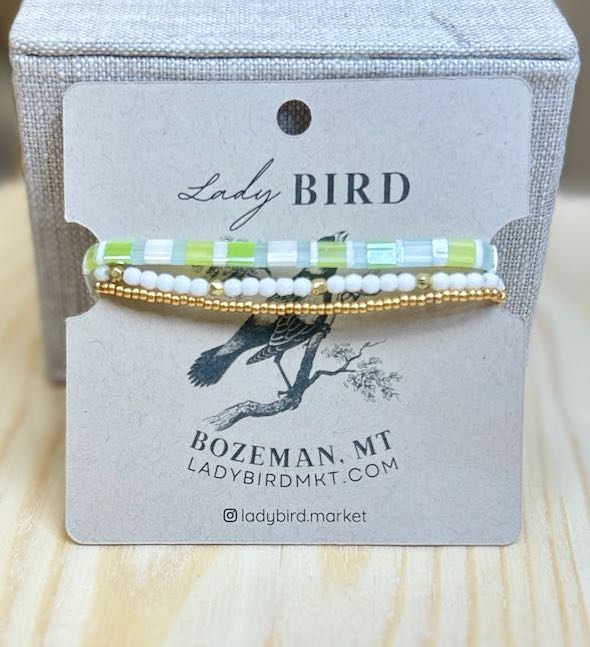 Mixed shades of green tile beads are patterned with white and silver or gold for this stretchy Japanese glass tile bead bracelet. It's accompanied by your choice of a complementary white or lime green & silver or gold Czech glass beaded stretchy wrap that goes around your wrist two times.