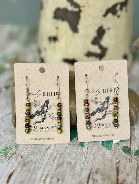 Unique and fun mixed imperial jasper gemstones are paired with silver or gold metal to create bohemian-style dangle earrings with class. Imperial Jasper is a stunning and colorful gemstone that showcases a blend of vibrant hues, including shades of pink, green, purple, red, and blue. Each bead is unique, often featuring intricate swirls, veins, and patterns that create a marbled effect. The combination of bold and soft colors gives it a dynamic and eye-catching look, perfect for anyone drawn to its artistic and natural beauty. The surface of Mixed Imperial Jasper is typically polished to a smooth, glossy finish, enhancing the depth and richness of its varied colors.