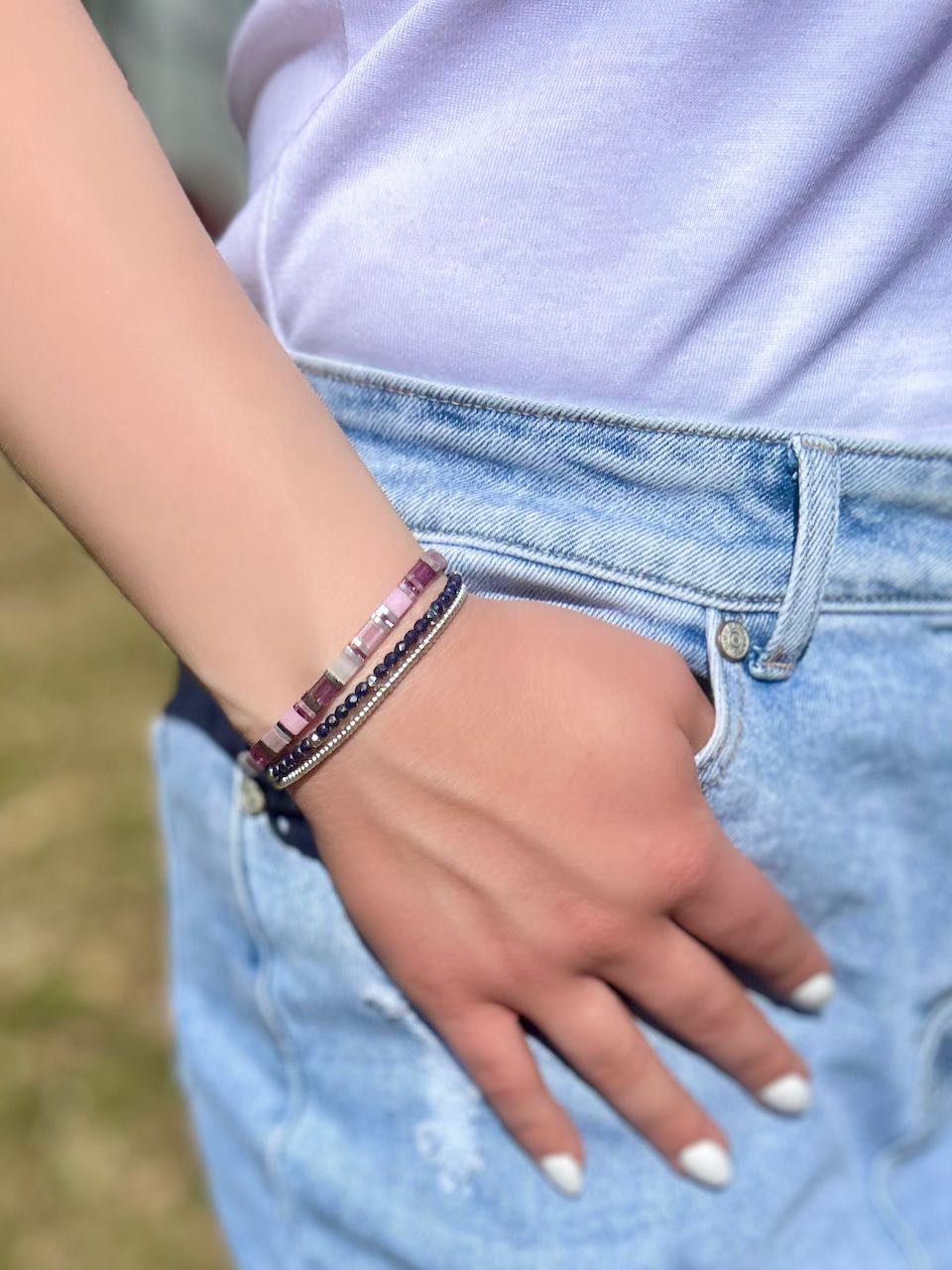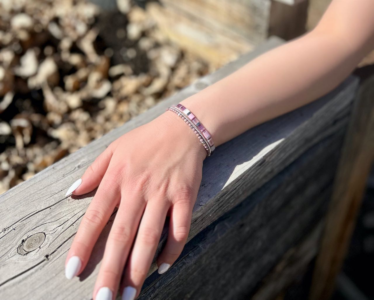 Different shades of purple and light pinks are paired with silver for this stretchy Japanese glass tile bead bracelet, accompanied by your choice of a complementary deep purple & silver or light purple & silver Czech glass beaded stretchy wrap that goes around your wrist two times.