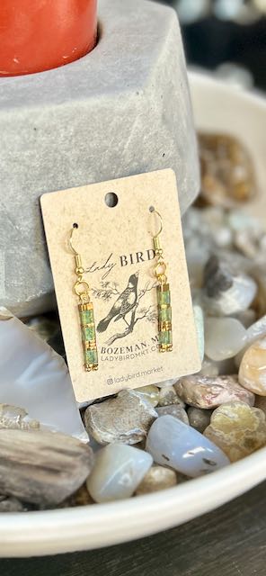 Classy yet casual, with a tinge of boho style, these tila bead dangle earrings feature a mix of speckled mossy-green tila beads with gold or silver, designed to make you and your outfit happy. Pair it with a matching mossy green stacked tila bead bracelet set or one of our stretchy seed bead wrap bracelets for the win!