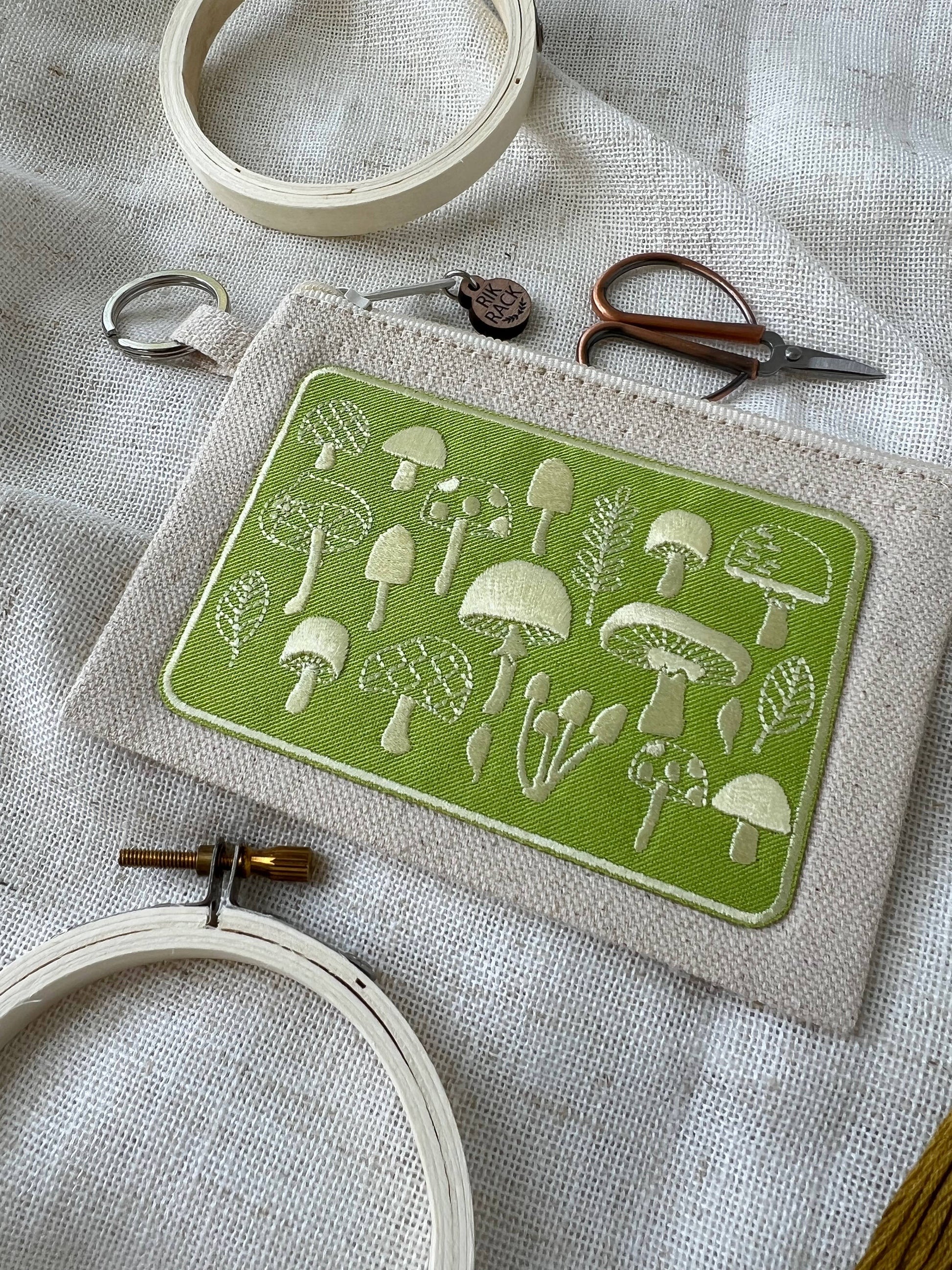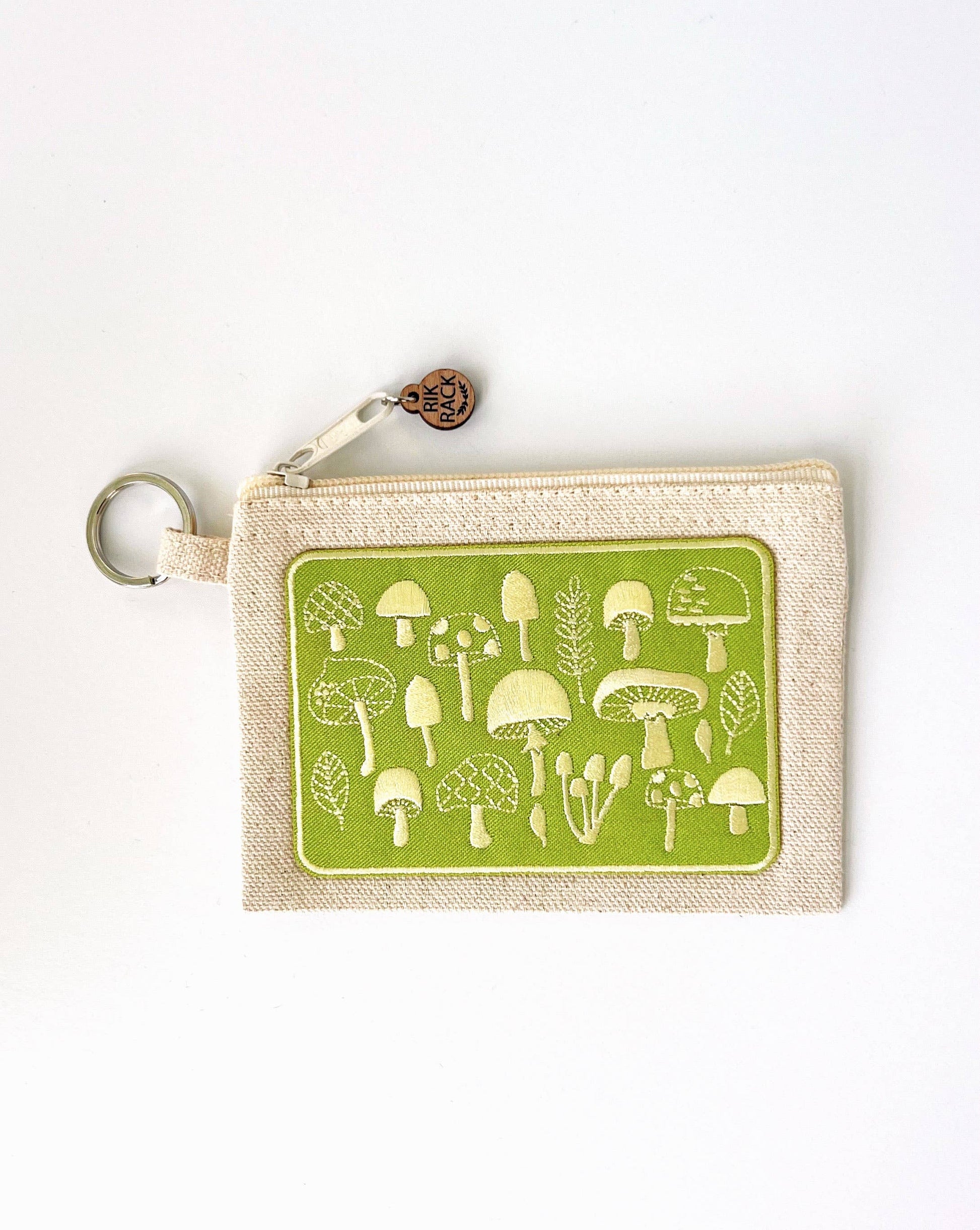Carry your essentials in style with our Mushroom embroidered zipper keyring pouch wallet. This charming pouch features a beautiful assortment of mushrooms embroidered on a natural cotton canvas. The matching off white zipper and wooden Rikrack brand zipper pull add a touch of elegance. With a loop for the attached keyring, it's both pretty and practical. 3x5.5 inches plus loop. embroidered section is 4x2.5 inches. Spot clean only.