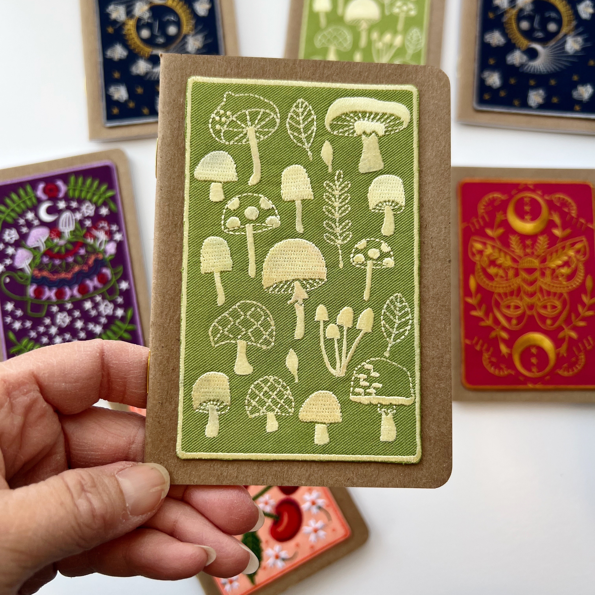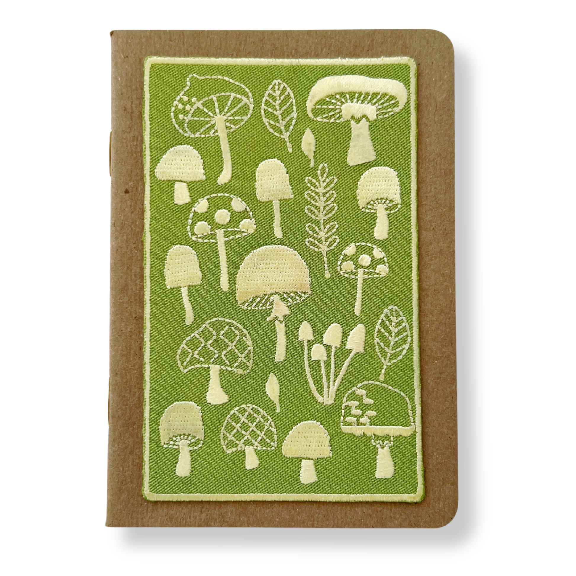 Collection of embroidered Mushrooms on Kraft paper pocket notebook. Embroidered appliqué on kraft paper 3.5X5 inch 32 page blank sheet journal. Perfect for tucking in your bag or pocket. Blank high quality paper allows you to write or sketch. Rikrack logo stamped on back.