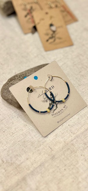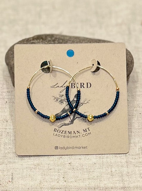 Classic Navy Blue & Gold or Silver Beaded Hoop Earrings