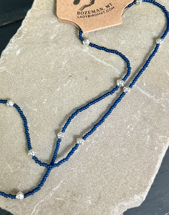 Made with navy blue Czech glass seed beads, with unique chunks of gold metallic beads on strong elastic cording. These delicate, simple, and classy stretchy Boho beaded necklaces go right over the head, without the hassle of a clasp.