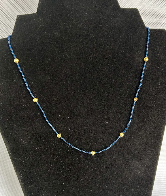 Simply Delicate Navy Blue Seed Bead Stretchy Necklace with Chunky Gold Beads