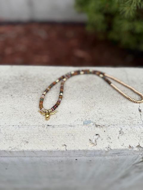 Choice of gold- or silver-plated accent beads and steer skull pendant