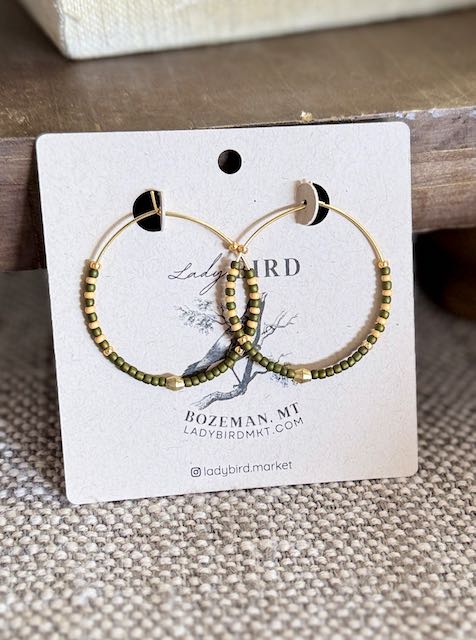 Perfect for fall boho style vibes, these olive green & tan striped beaded hoops are super easy to wear and made with high-quality, delicate Czech glass seed beads - the perfect mix of edgy and classic style.