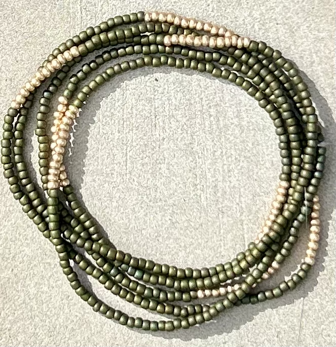 Made with olive green Czech glass seed beads and stripes of gold metallic seed beads, our wrap bracelets are designed to add a touch of bohemian flair to any outfit. Handcrafted with strong elastic cording, these stretchy bracelets effortlessly wrap around your wrist five times or around your neck two times as a choker-style necklace, providing a comfortable, lightweight, durable fit for all-day wear and active outdoor play.