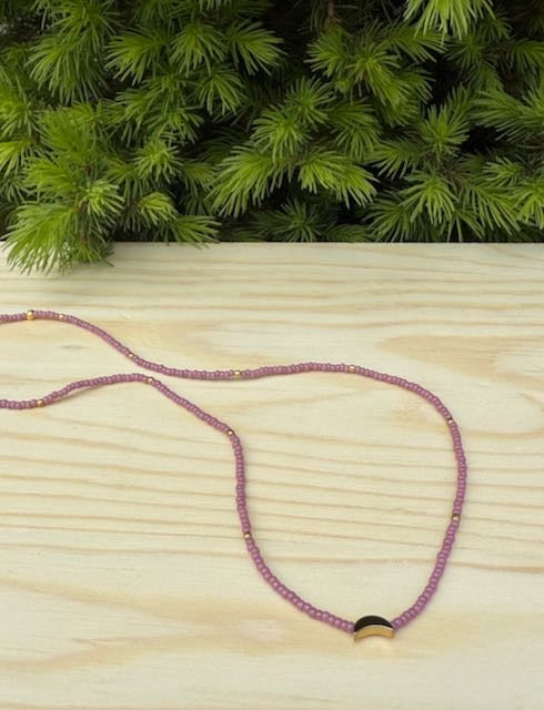 A petite polished gold-plated hematite moon charm pendant anchors the piece. Hematite is a healing mineral, and this nature-inspired jewelry detail pairs beautifully with the bead tones and any outfit for easy everyday wear. The minimalist design makes it perfect for layering or wearing alone as a delicate statement.