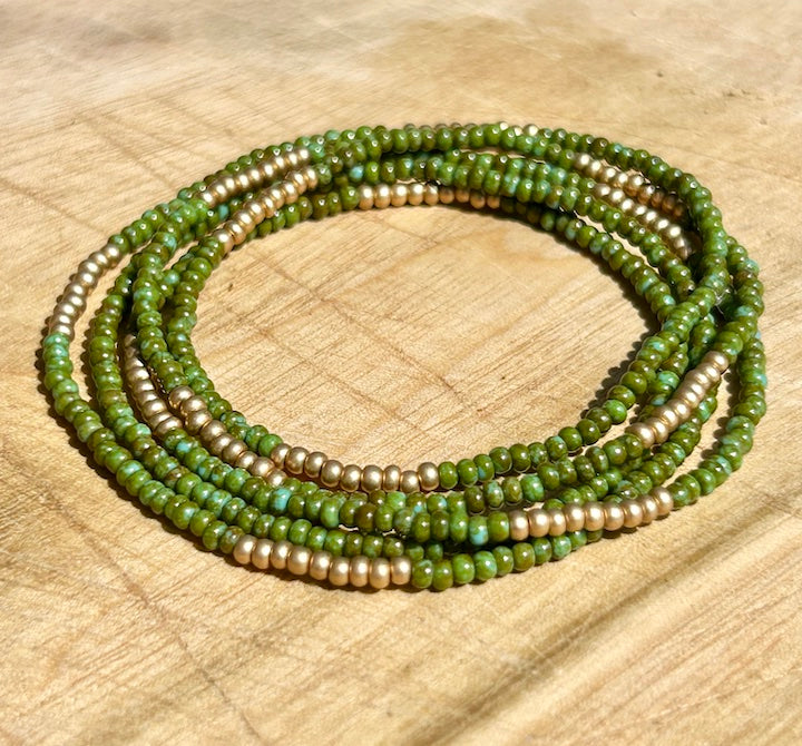 Made with beautiful speckled hunter-green-hued Czech glass seed beads and featuring gold metallic decorative beads, these wrap bracelets are designed to add a bohemian flair to any outfit. Made with strong elastic cording, these stretchy bracelets effortlessly wrap around your wrist five times or around your neck two times as a choker-style necklace, providing a comfortable, lightweight, durable fit for all-day wear and active outdoor play.